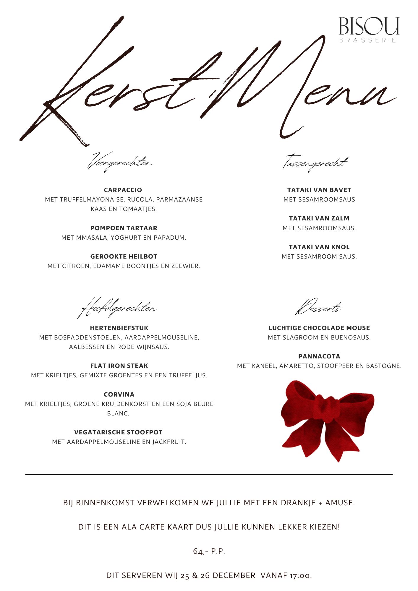 Kijk bij onze evenementen voor ons kerstmenu! Graag telefoonisch reserveren voor kerst, via 0317418418.